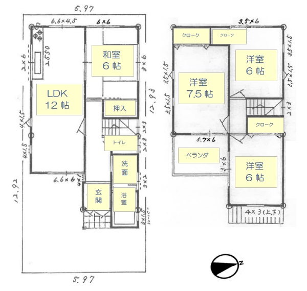 ●1階/LDK12、和6 ●2階/洋6×2、洋7.5 |