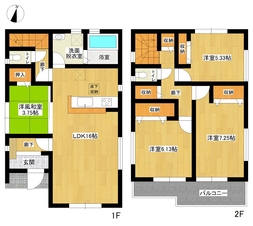 | ●1号棟:3380万円(土地100.04u・建物93.96u) ●2号棟:3380万円(土地100.05u・建物93.35u) |