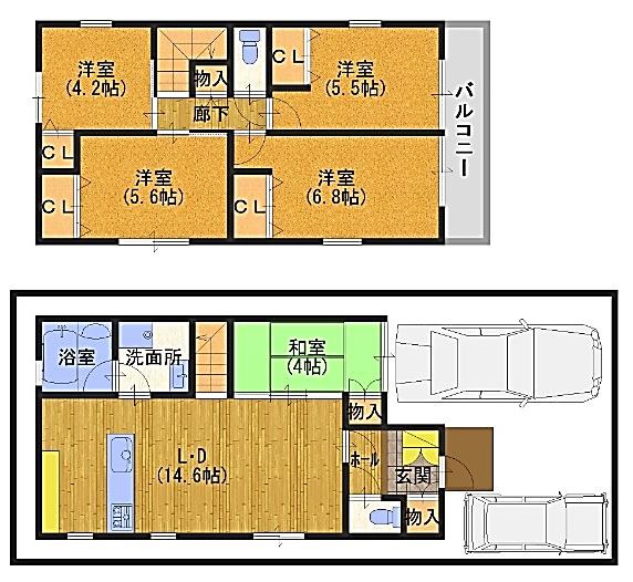 ●1階/LDK14.6、和4 ●2階/洋4.2、洋5.5、洋5.6、洋6.8 |