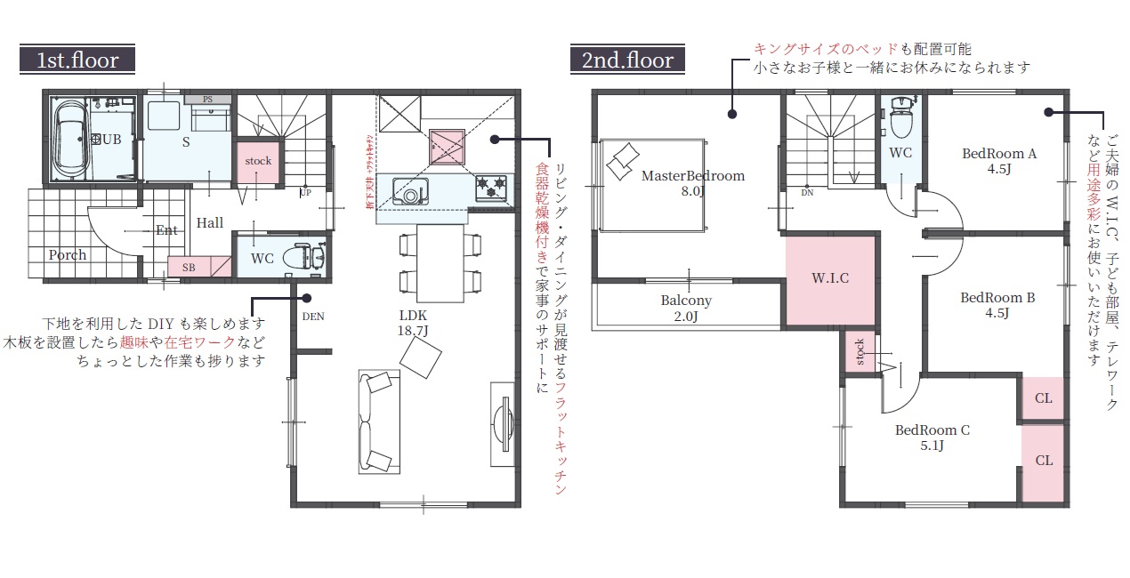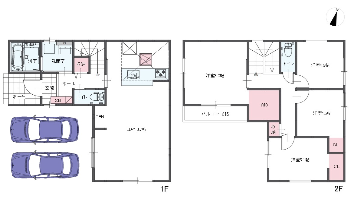 ●1階/LDK18 ●2階/洋4.5×2、洋5.1、洋8 |