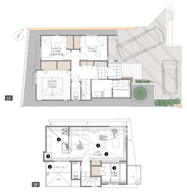 ●1階/洋4.13、洋4.15、洋6 ●2階/LDK16.53、和3.5 |