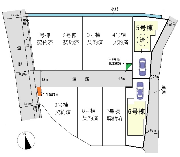 | ●6号棟:3280万円(3LDK+WIC・土地面積130.57u・建物101.24u・(ルーフバルコニー面積8.10uを含む) ●契約済:1・2・3・4・5・7・8・9号棟 |